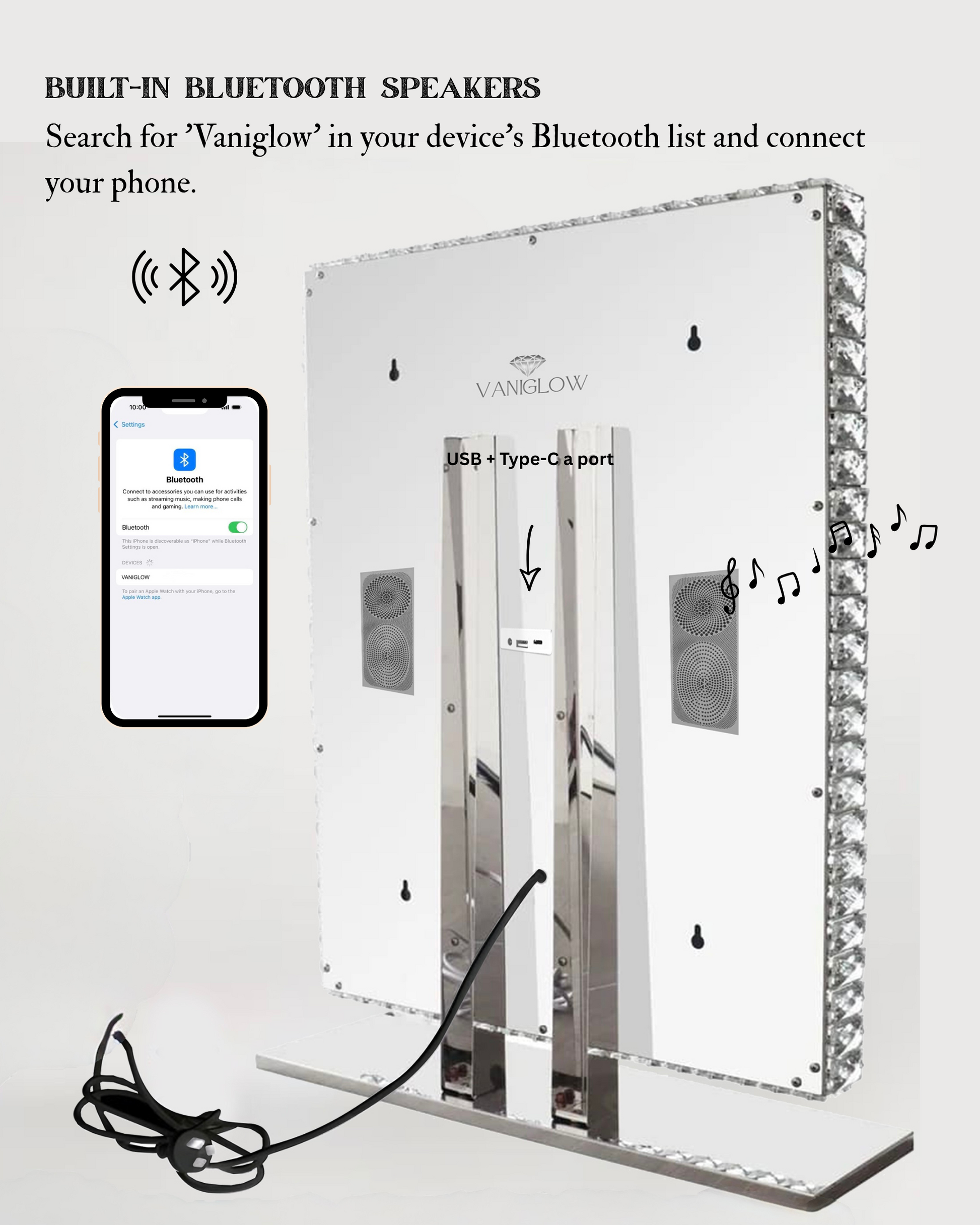 A: Our Hollywood-style mirrors come with built-in Bluetooth and touch controls on select models.