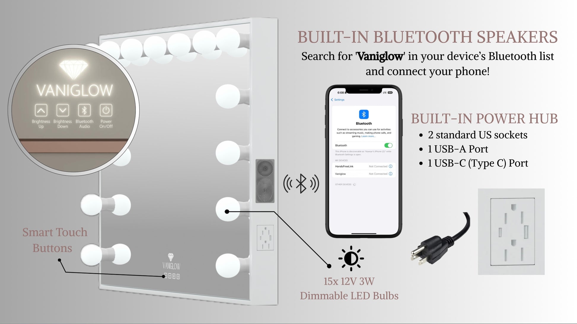 A: Our Hollywood-style mirrors come with built-in Bluetooth and touch controls on select models.