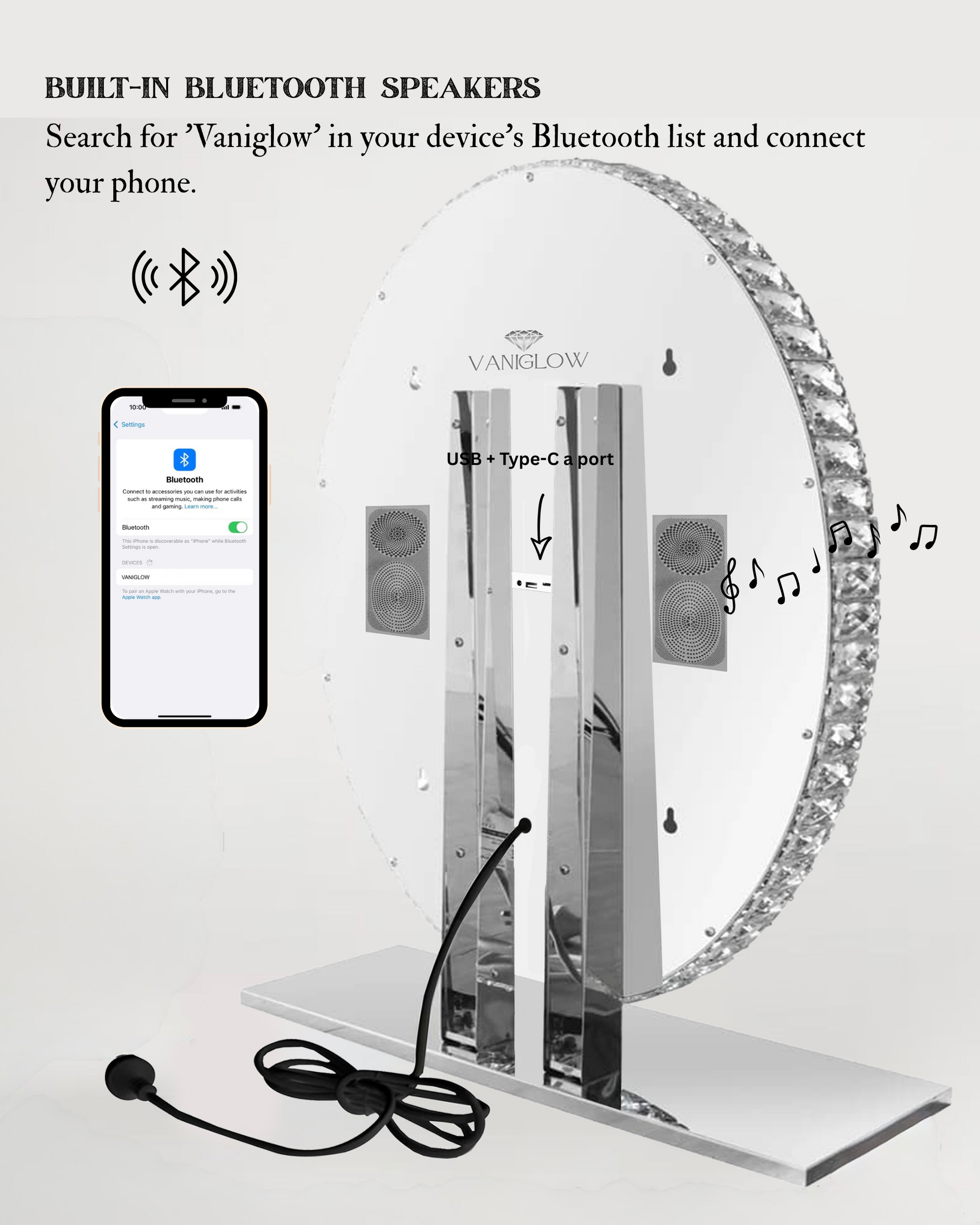 Designed for both elegance and functionality, it features adjustable LED lighting in warm, natural, and white tones — all easily controlled with a gentle touch. Built-in Bluetooth speakers let you play your favorite music while you get ready, and the USB + Type-C ports keep your devices fully charged.