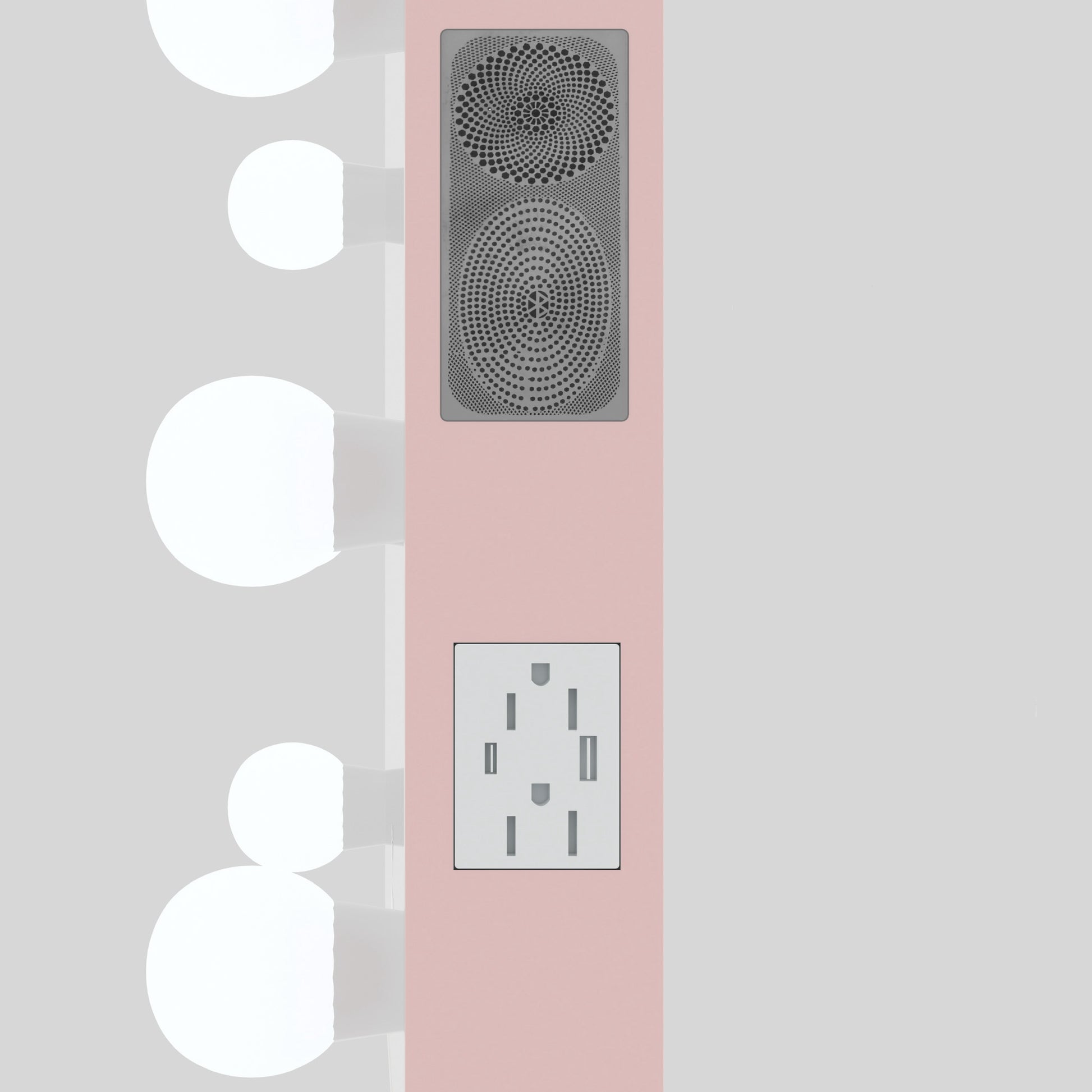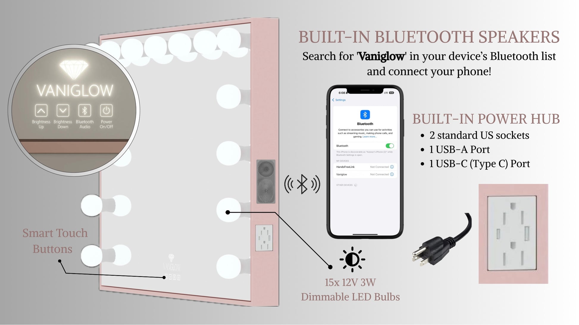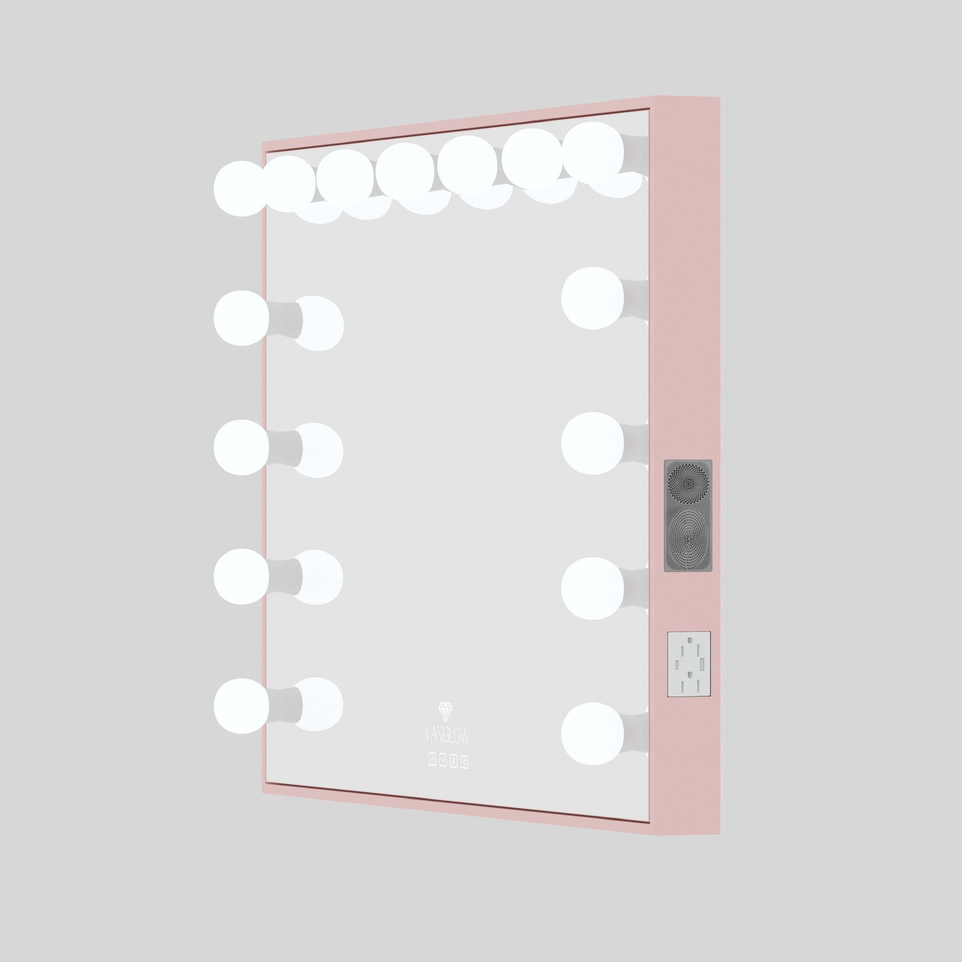 Elevate your beauty routine with the Rosé Glow Mirror—an enchanting LED vanity featuring a blush-pink frame and built-in Bluetooth speakers. Experience flawless lighting with touch-controlled light modes, and charge your devices hands-free via integrated USB-A, USB-C, and power outlets. Sparkle effortlessly while you glow.