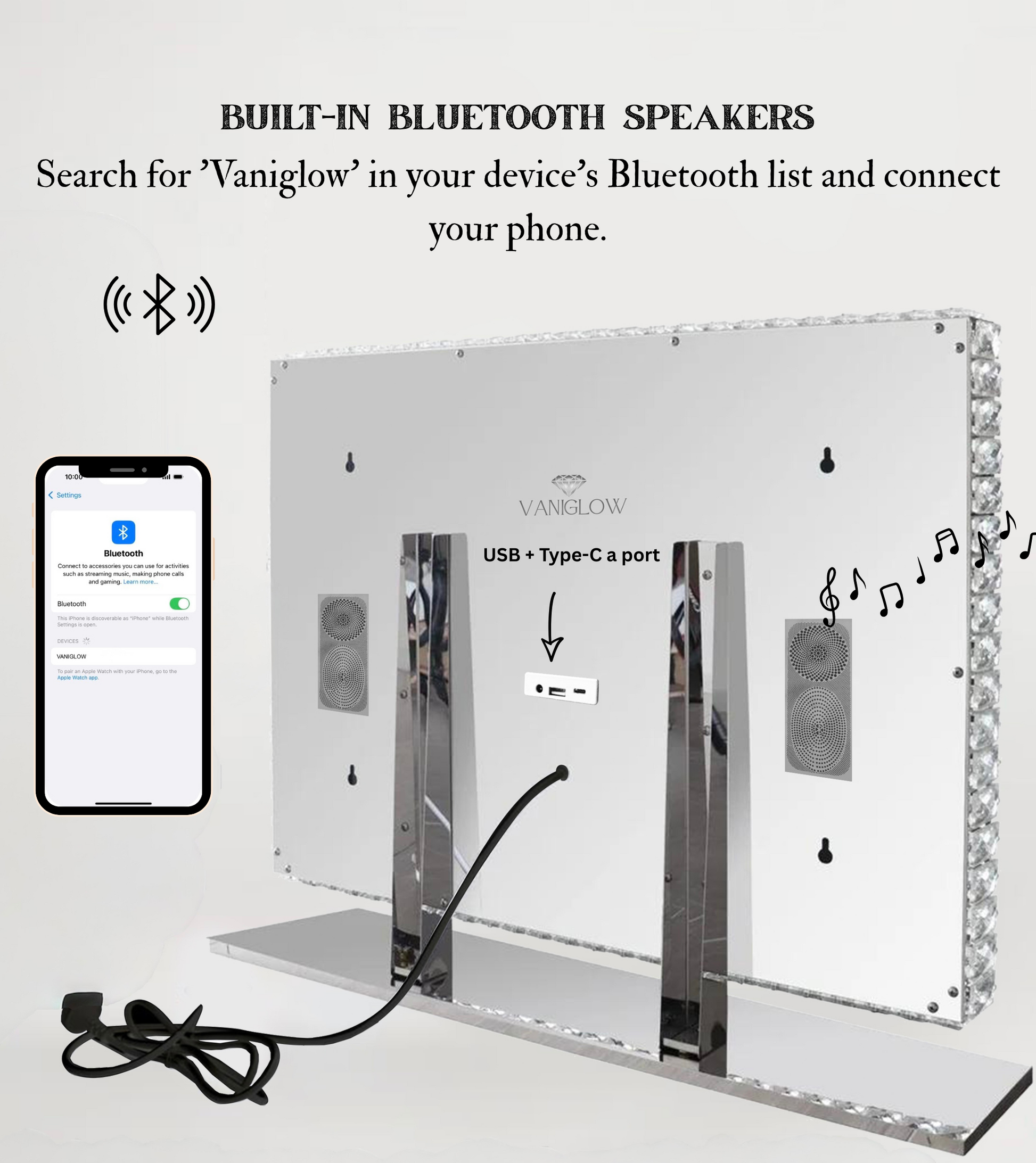 Enjoy flawless lighting with touch-sensitive LED controls, offering 3 color modes: warm, natural, and white. Connect wirelessly with built-in Bluetooth speakers, and keep your devices charged with USB and Type-C ports — all while getting ready in style.